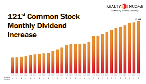 Неотдавна всички тук се тревожеха за REITs и пазара на недвижими имоти, но тази тема някак си отшумя. Както и да е, спокойно държах и продължавам да държа акциите на $O, която между другото обяви поредното увеличение на месечния си дивидент до 0,2555 долара на акция, като годишната сума възлиза на 3,066 долара на акция. Това е 121-ото увеличение на месечния дивидент за обикновените акции от листването им на NYSE през 1994 г.!