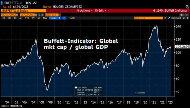 Индикаторът за срив на Бъфет отново бие тревога, след като акциите нараснаха неимоверно през тази година. Сега стойността на световните акции е по-голяма от световния БВП.