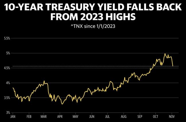 През октомври бяха добавени само 150 000 работни места, което не отговаря на очакванията, които бяха за 30 000 повече. През последните 9 месеца 8 пъти се наблюдаваше забавяне на растежа на работните места. Тази седмица виждаме обещаващи печалби на индекси като $^GSPC $^NDX $^DJI, докато доходността на съкровищните облигации се понижи. Доходността на 10-годишните съкровищни облигации, която неотдавна достигна 16-годишен връх, се считаше за насрещен вятър за акциите, в петък спадна до 4,5%.