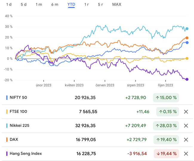 Тук съм дал само малък подбор от примери за тази година, 2023 г. Не приемайте сравнението твърде сериозно. Не можах да поставя повече от 5 индекса в една графика. Освен това, за да се впиша в пазари, различни от САЩ, пропуснах SP500, Nasdaq100 и не поставих индекс за Китай. Това, което също трябва да се каже, е, че подобно на САЩ, индексите до голяма степен са повлечени от тяхната селекция, като имам предвид, че S&P500, както знаем, не повлича всички 500 акции, а максимум 7-10 водещи компании. 😊