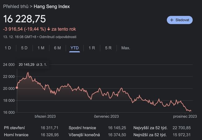 Хонконгският индекс Hang Sengje е на път да регистрира четвърта година на спад и е най-зле представящият се сред основните азиатско-тихоокеански фондови пазари. Миналата седмица Moody's намали перспективата си за Хонконг от стабилна на негативна, позовавайки се на финансовите, политическите, институционалните и икономическите връзки на града с континентален Китай. Понижаването на рейтинга дойде скоро след като Moody's намали перспективата си за кредитния рейтинг на китайското правителство от отрицателна на стабилна.